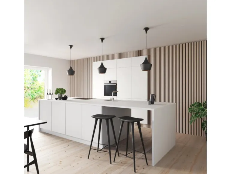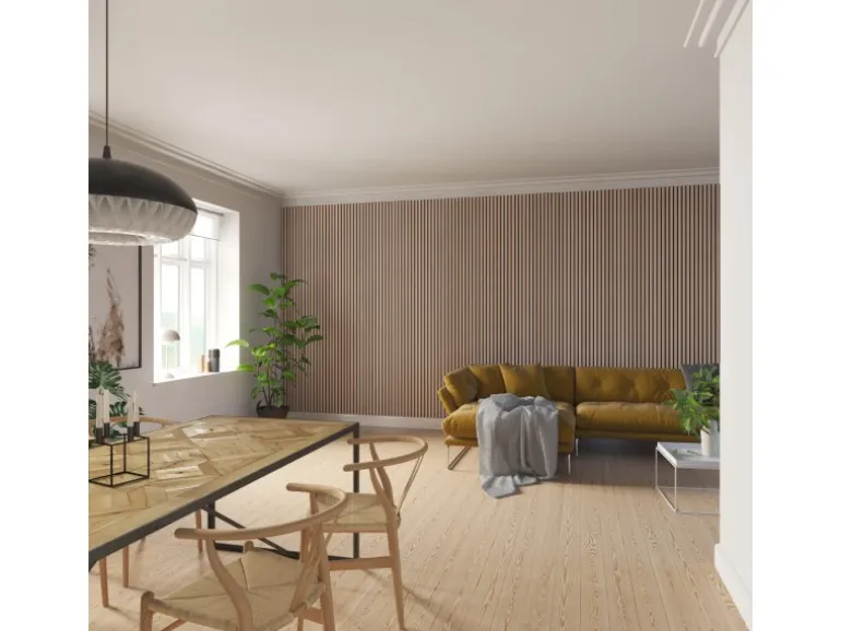 Die Akustikplatten lassen den Raum dank ihres Holzlooks tiefer und größer wirken. Kombinieren Sie verschiedene Formen und Proportionen von Akustikpaneelen, um einzigartige Muster und Designs an Wänden und Decken zu gestalten. Die Oberflächen aus echtem Holzfurnier unterstützen den skandinavischen Stil des Panels.