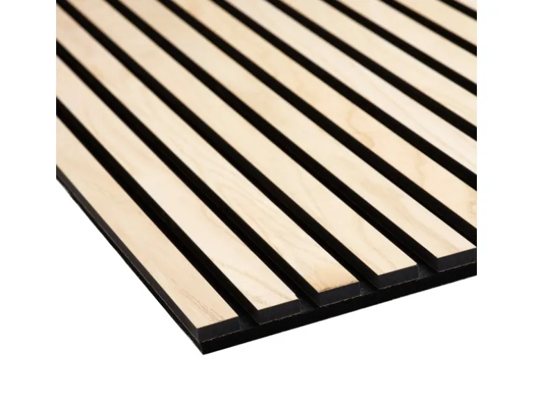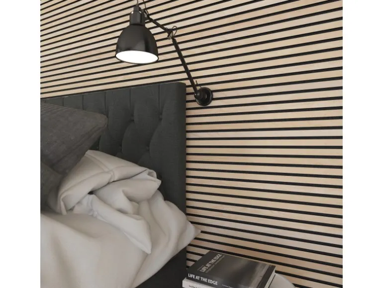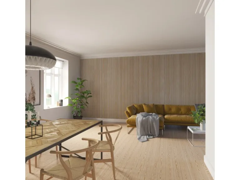 Die Akustikplatten lassen den Raum dank ihres Holzlooks tiefer und größer wirken. Kombinieren Sie verschiedene Formen und Proportionen von Akustikpaneelen, um einzigartige Muster und Designs an Wänden und Decken zu gestalten. Die Oberflächen aus echtem Holzfurnier unterstützen den skandinavischen Stil des Panels.