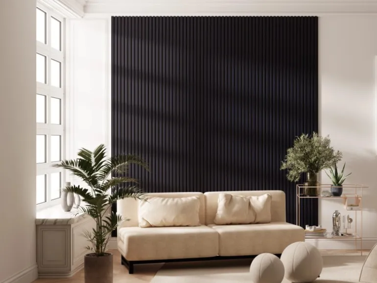 Die Akustikplatten lassen den Raum dank ihrer Streifenoptik tiefer und größer wirken. Kombinieren Sie verschiedene Formen und Proportionen von Akustikpaneelen, um einzigartige Muster und Designs an Wänden und Decken zu schaffen. Die Oberflächen in Folie unterstützen den skandinavischen Stil des Panels.