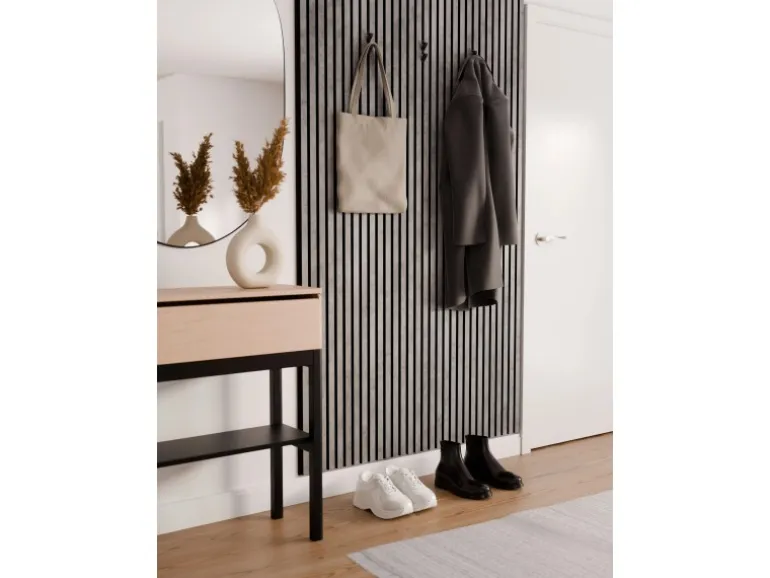 Die Akustikplatten lassen den Raum mit ihrem Streifenmuster tiefer und größer wirken. Kombinieren Sie verschiedene Formen und Proportionen der Akustikpaneele, um einzigartige Muster und Designs an Wänden und Decken zu schaffen. Die Oberflächen in Laminat unterstützen den skandinavischen Stil der Paneele.