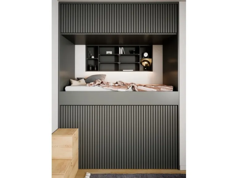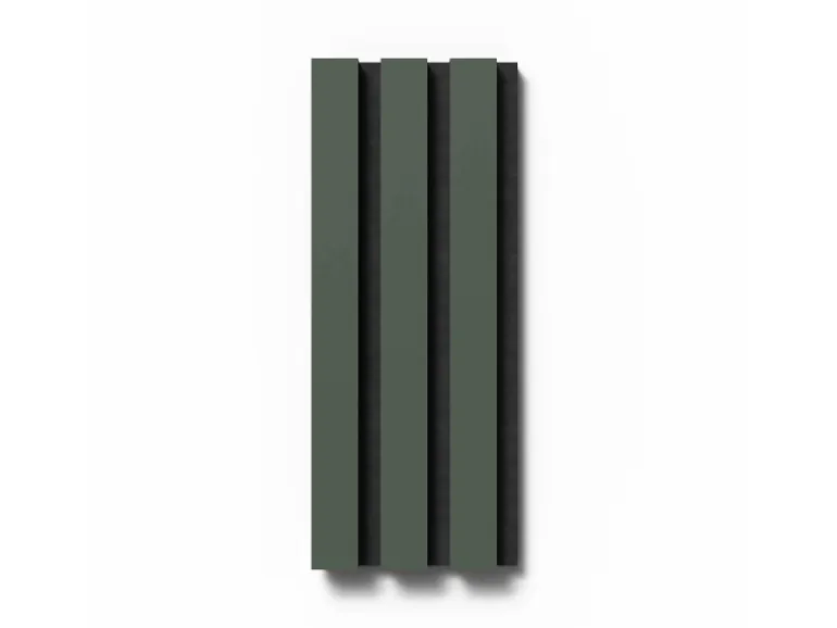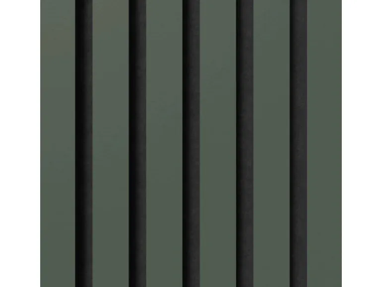 Die Akustikplatten lassen den Raum dank ihrer Streifenoptik tiefer und größer wirken. Kombinieren Sie verschiedene Formen und Proportionen von Akustikpaneelen, um einzigartige Muster und Designs an Wänden und Decken zu schaffen. Die Oberflächen in Linoleum unterstützen den skandinavischen Stil des Panels.