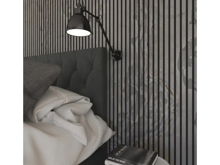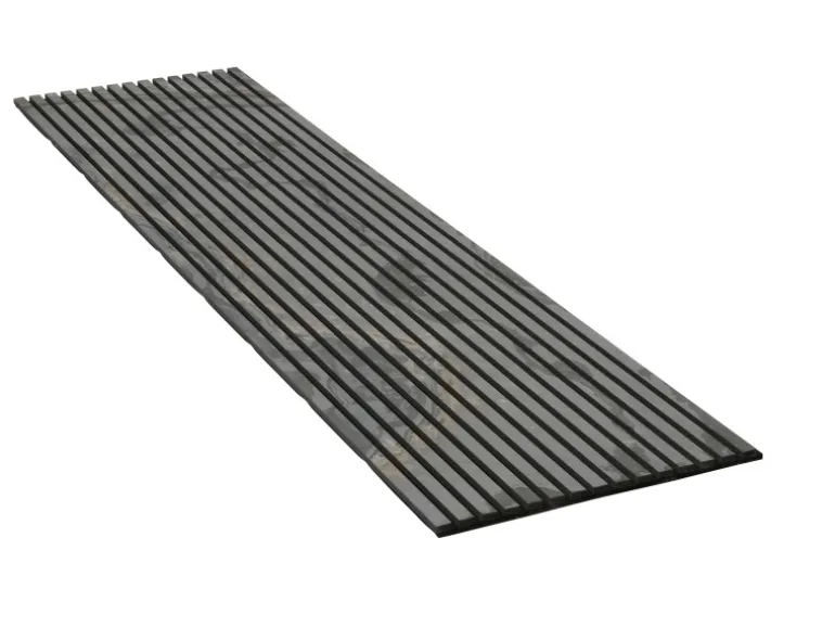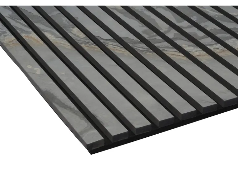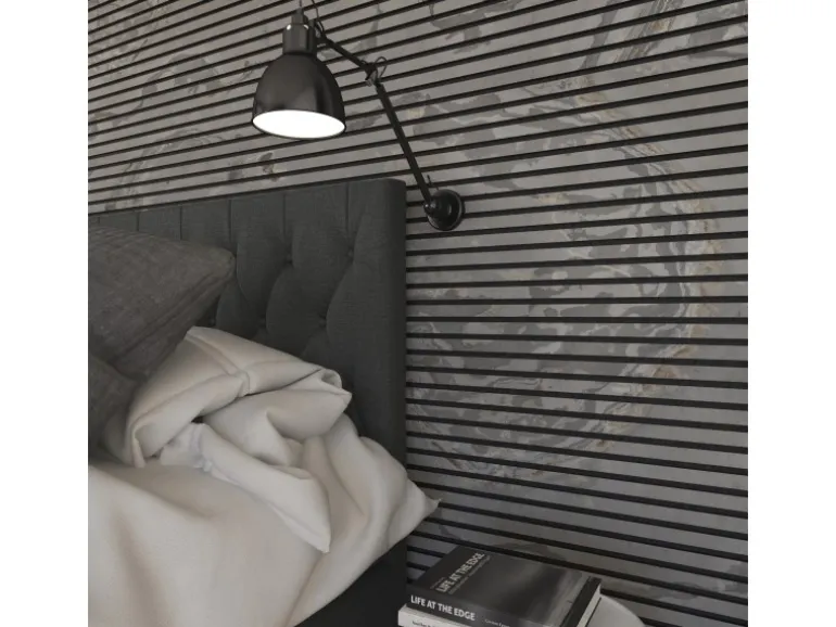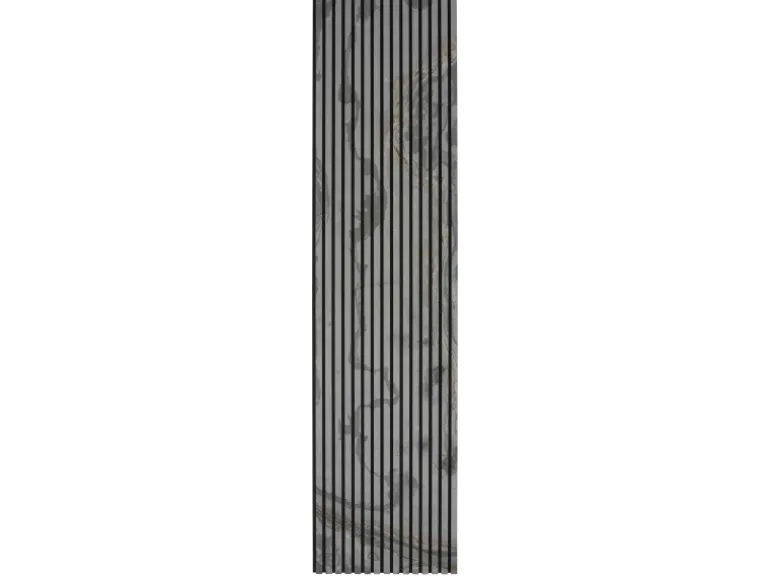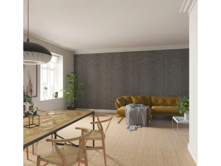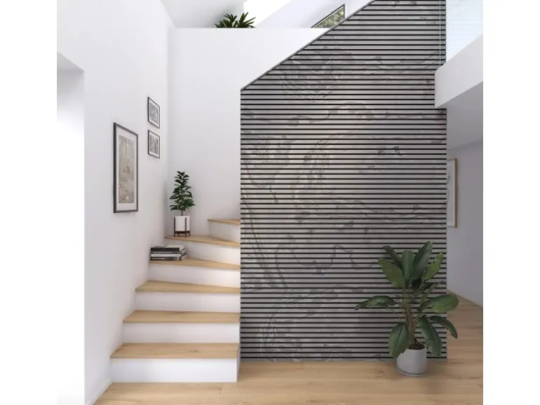Die Akustikplatten lassen den Raum mit ihrer Streifenoptik tiefer und größer erscheinen. Durch die Kombination verschiedener Formen und Proportionen der Akustikpaneele können Sie einzigartige Muster und Designs an Wänden und Decken schaffen. Die Oberflächen im Stein-Look unterstützen den skandinavischen Stil des Panels.