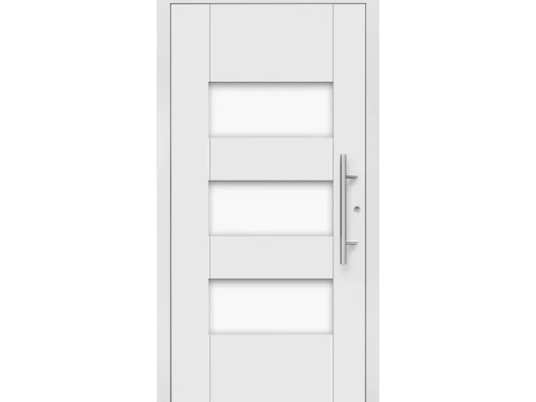 In die Aluminium-Haustür sind drei satinierte 3-fach ISO Verglasungen mit warmer Kante eingesetzt, welche von außen durch robustes VSG-Sicherheitsglas ergänzt und verstärkt wird. Dabei begünstigen die satinierten Glasscheiben eine hervorragende Wärmedämmung sowie eine hohe Lichtdurchlässigkeit und sorgen für eine vollkommene Intransparenz, die dem Schutz Ihrer Privatsphäre dient.