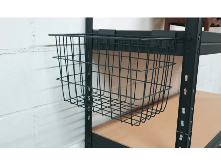Der Rivet Stahlgitter Korb Anthrazit Grau wird an die längs oder Quertraversen der Rivet Regale aufgehängt.