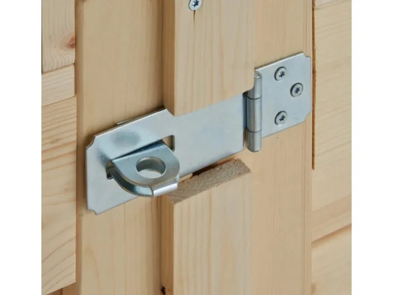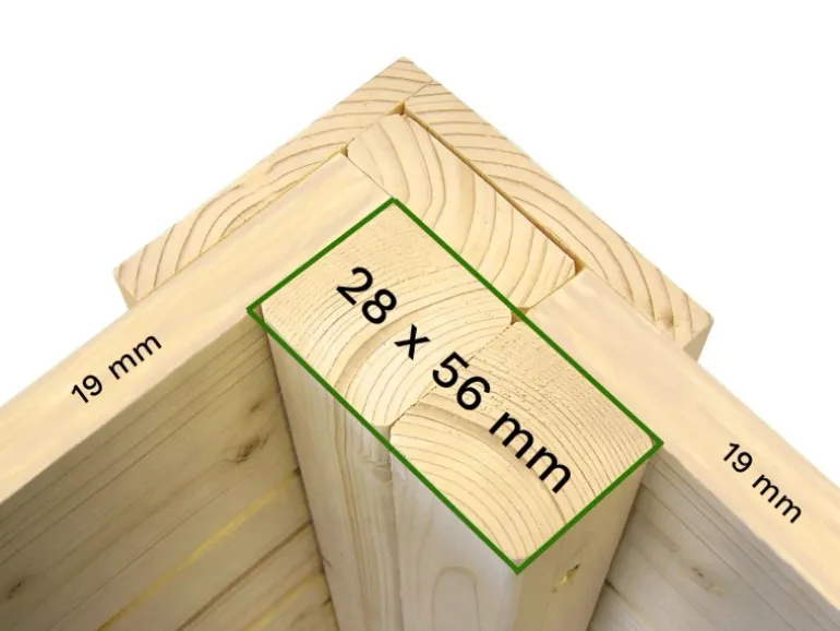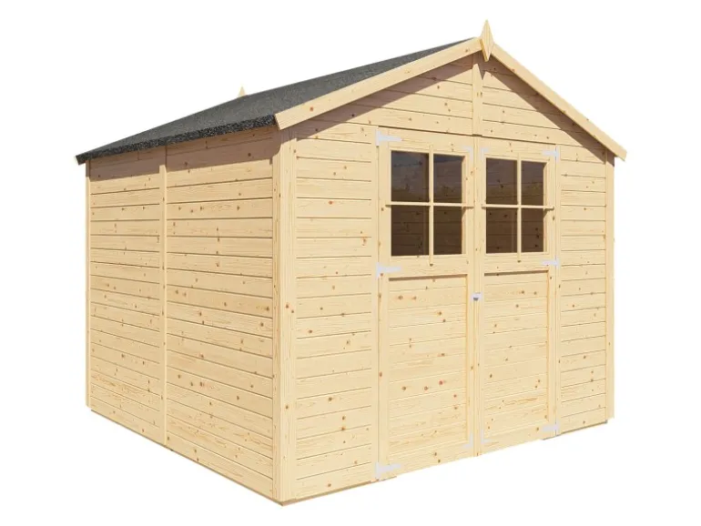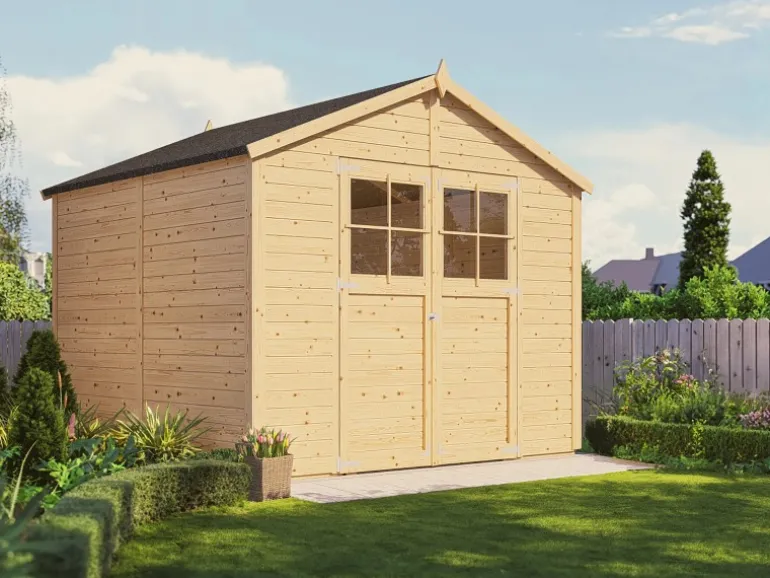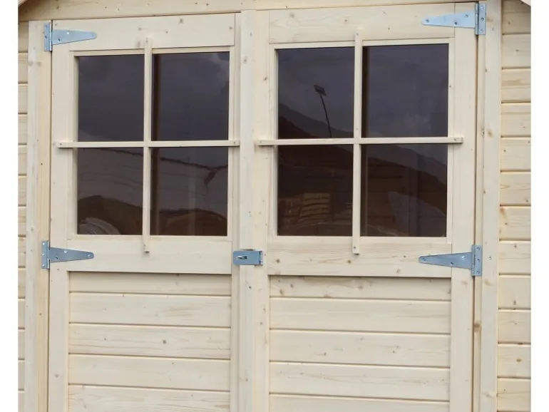 Die Türen des Holzgartenhauses verfügen über Lichtausschnitte und Beschläge zum Anbringen eines Vorhängeschlosses. Mit einer Wandstärke von 19 mm ist die Konstruktion des Gartenhauses sehr stabil. Das Satteldach trägt eine maximale Schneelast von 87 kg/m² und eignet sich besonders gut für hochwertige Dachschindeln als Dacheindeckung.