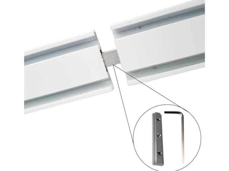 Die Schienen aus hochwertigem Aluminium werden je nach Größenwahl nicht am Stück geliefert ( ab 180cm ). Bei geteilten Schienen liefern wir passende Verbinder mit die nach der Montage unsichtbar in der Schiene verbleiben.