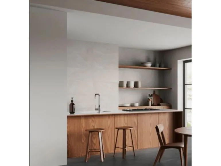 Die Bodenfliese erzeugt dank ihrer hochmodernen Naturstein-Optik ein besonders schnörkelloses und modernes Ambiente. Gerade in Kombination mit natürlichen Holzmöbeln entsteht so ein sehr trendiger Look. Der helle Farbton schafft eine wohnliche Atmosphäre und vergrößert den Raum optisch. Das Rechteckformat sorgt für gerade Linien und eine harmonische Flächenwirkung.