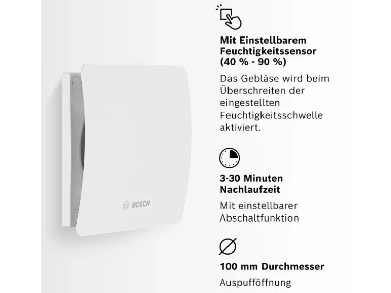 Der weiß-glänzende Bosch Badlüfter Fan 1500 DH W 100 hat einen Durchmesser von 100 mm. Er verfügt über einen Luftfeuchtigkeitssensor und einstellbare Nachlaufzeit. Er kann dank der mitgelieferten Schrauben und Dübel auf der Wand montiert werden.