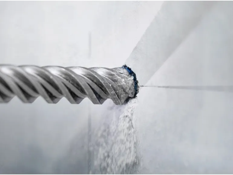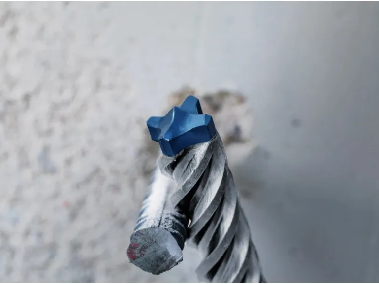 Der Vollhartmetallkopf auf dem Expert SDS Max-8X ist ein fortschrittlicher 4-Schneider, der aus einem einzigen Stück des härtesten Metalls besteht: Es verklemmt nicht und zeigt keine Schwäche beim Hammerbohren. Dank der Bosch Carbide Technology und des Vollhartmetallkopfs hält der Expert SDS Max-8X weitaus länger als normale Hammerbohrer.