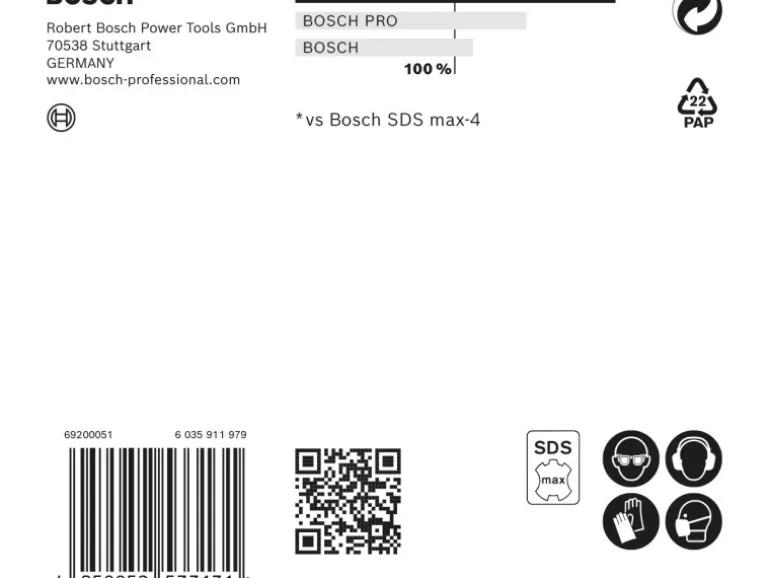 Der Vollhartmetallkopf auf dem Expert SDS Max-8X ist ein fortschrittlicher 4-Schneider, der aus einem einzigen Stück des härtesten Metalls besteht: Es verklemmt nicht und zeigt keine Schwäche beim Hammerbohren. Dank der Bosch Carbide Technology und des Vollhartmetallkopfs hält der Expert SDS Max-8X weitaus länger als normale Hammerbohrer.