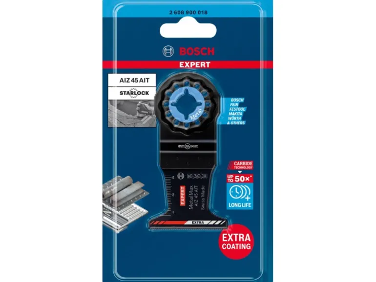 Das Bosch Expert Tauchsägeblatt für Metall hält bis zu 50-mal länger als ein Bosch AIZ 20 AB Blatt – Wenn gehärtete Schrauben rosten oder auf andere Weise stecken bleiben, besteht die einzige Option darin, sie flach an der Oberfläche abzuschneiden. Der Expert MetalMax macht auch in gehärtetem Metall einen perfekten bündigen Schnitt. Mit seiner herausragenden Langlebigkeit ist es das perfekte Zubehör für Handwerker, die harte Materialien mit einem Multifunktionswerkzeug schneiden möchten. Der Expert MetalMax ist das Neueste, was die Bosch Carbide Technology zu bieten hat. Die Zähne bestehen nicht nur aus einer extrem harten Metallleiste, die sogar Edelstahl schneiden kann, sie verfügen auch über eine Hightech-Zusatzbeschichtung für maximale Langlebigkeit. Die gerade Schneidkante ist zum Ablängen optimiert, da sie weniger zum Wegrutschen auf Schrauben und Rohren neigt. Sie haben gesehen, wie mühelos das Multifunktionswerkzeug in und durch Holz sägen kann: Mit dem Bosch Expert MetalMax Blatt für Multifunktionswerkzeuge kann Metall genauso zersägt werden. Es sägt sogar mühelos gehärtete Fensterschrauben und Armierungen. Starlock-Aufnahme für optimale Kraftübertragung und bequemen Blattwechsel innerhalb von 3 Sekunden.