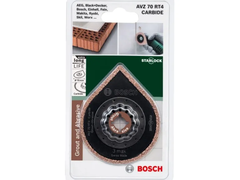 Der Bosch Starlock Carbide-RIFF Mörtelentferner AVZ 70 RT4 ist geeignet um Fugen an Wand- und Fußbodenfliesen auszufräsen und Mörtel oder Fliesenkleber zu entfernen (z. B. beim Austausch beschädigter Fliesen). Auch Fugen in den kleinsten Ecken können mit der Hartmetallspitze (Schleif- und Raspelzunge) entfernt werden. Das Starlock-System ermöglicht einen schnellen Wechsel der Klingen und Sägeblätter.