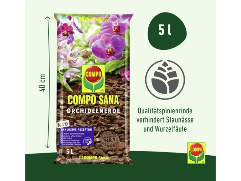 Die lockere, luftige Struktur der naturbelassenen Mittelmeerpinienrinde fördert die gute Durchlüftung und Drainage im Wurzelbereich. Staunässe wird vermieden. Das auf die Bedürfnisse von Orchideen abgestimmte Dünger-Depot wirkt sofort und gewährleistet eine bis zu 8 Wochen optimale, besonders milde Nährstoffversorgung.