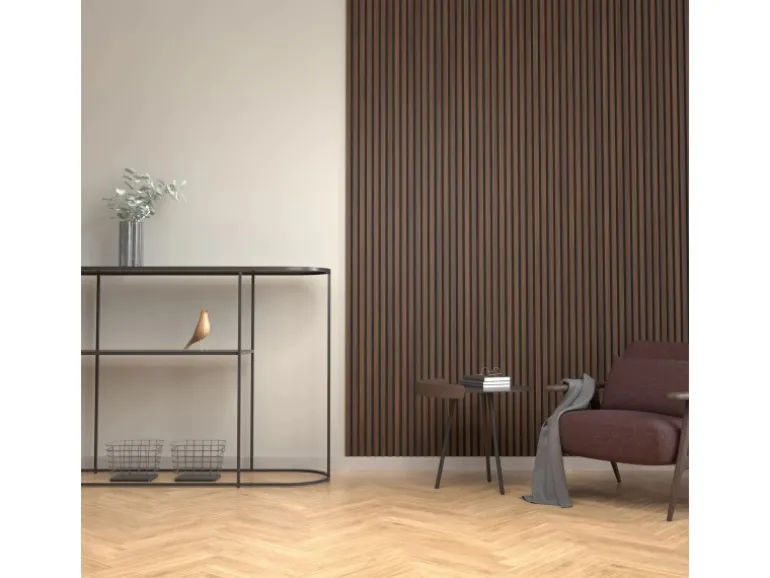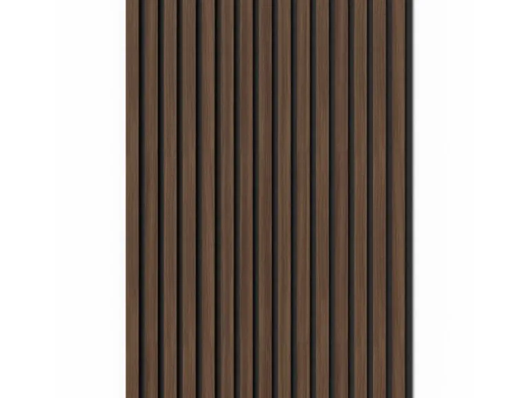 19 mm starke MDF-Leisten in der Farbe Walnuss auf schwarzem Akustik-Filz
