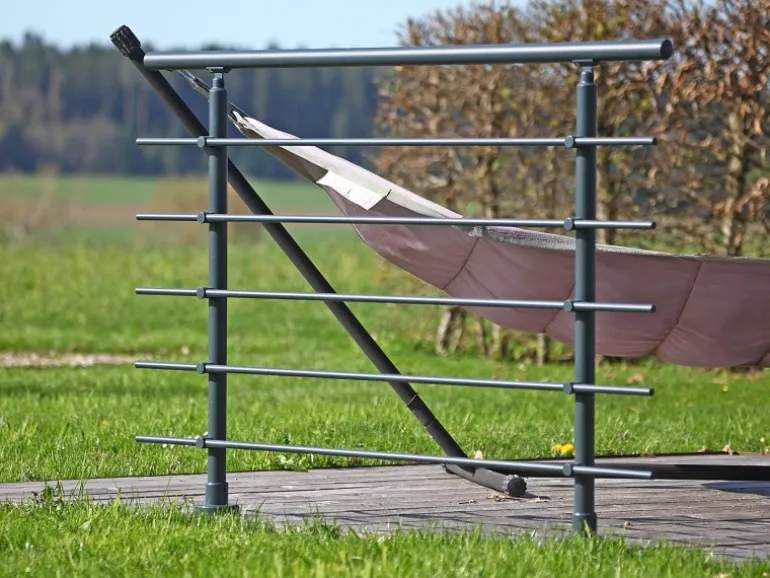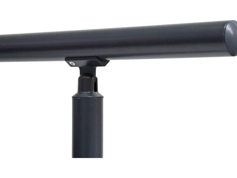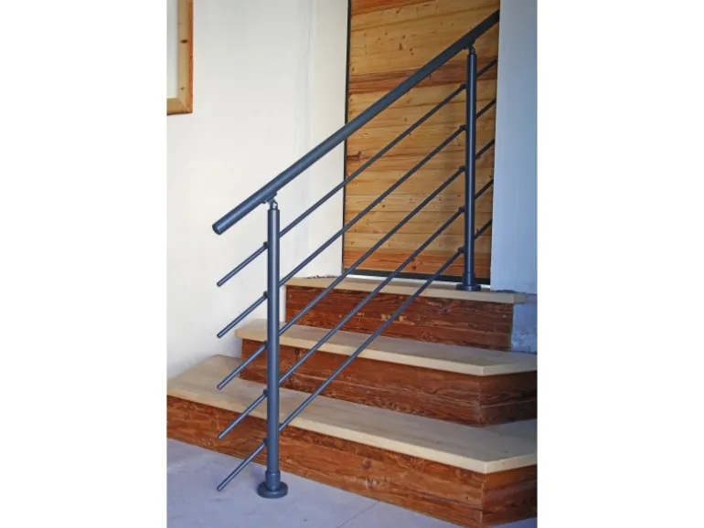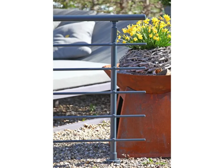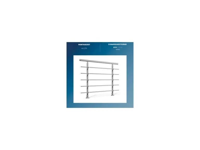 Die Höhe der 2 Stützen beträgt 950 mm mit jeweils 5 Rundstabhaltern und 5 Rundstäben à Ø 16 mm und 1500 mm Länge. Der Handlauf hat eine Länge von 1500 mm sowie Ø 40 mm. Die Montage erfolgt von oben. Im Lieferumfang enthalten sind neben 2 Stützen, 5 Rundstabhaltern, 1 Handlauf und 5 Rundstäben ebenfalls 2 Endkappen für den Handlauf und 10 Endkappen für die Rundstäbe. Weiterhin beinhaltet das Set Verbinder für den Handlauf sowie die Rundstäbe.