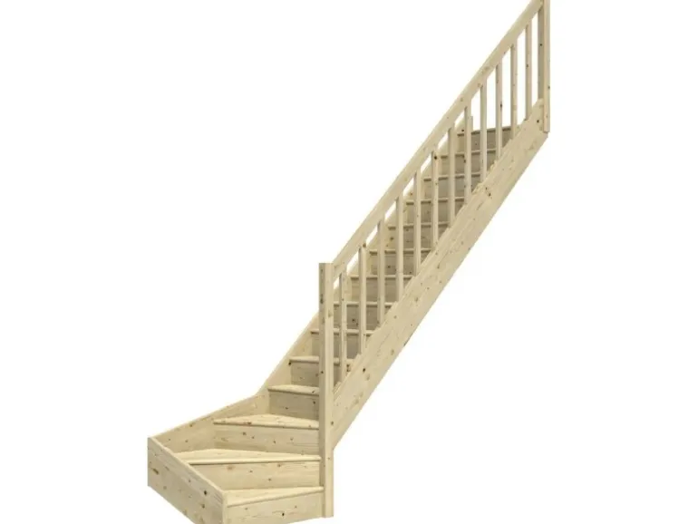 Die Treppe wird inklusive einem einseitigem Holzgeländer mit rechteckigen Geländerstäben geliefert.