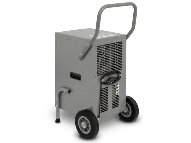 Das robuste Bau-Entfeuchtungsgerät hat ein stabiles Fahrwerk mit zwei massiven Gummi-Rädern