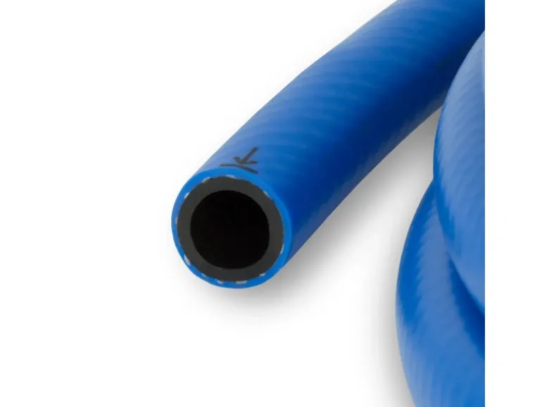 Der Kompressor-Schlauch aus Hybrid PVC Polymer mit Gewebe-Einlage hat 13mm Innendurchmesser, 19mm Außendurchmesser und der maximale Arbeitsdruck beträgt 20 bar, der Schlauch wird ohne Kupplung geliefert