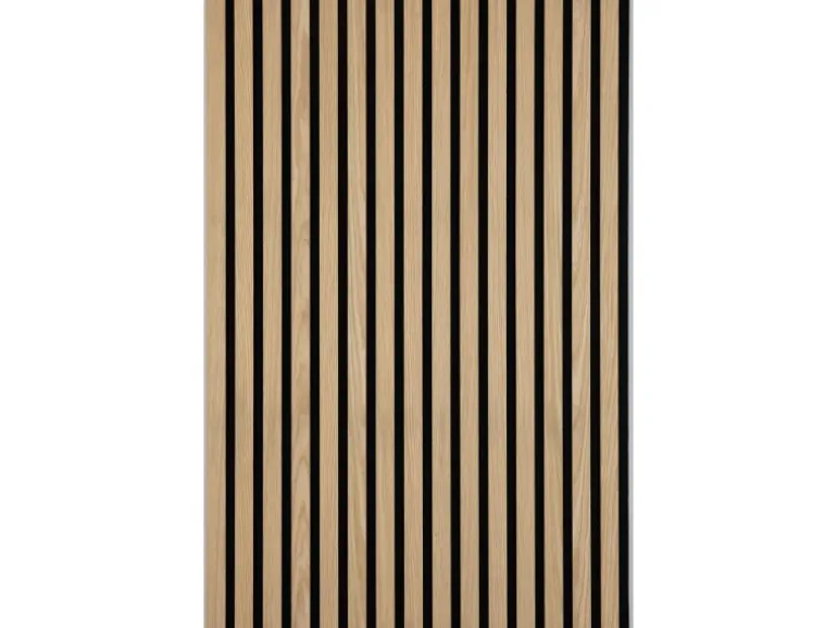Das Akustikpaneel Econ Eiche in den Maßen 240 cm x 60 cm x 1,8 cm besteht aus schwarzem MDF mit Eichenfurnier und schwarzem Filz. Mit dem Akustikpaneel Econ erhalten Sie eine Lösung zur effektiven Schallabsorption, die den Raumklang reduziert und die Raumakustik verbessert.