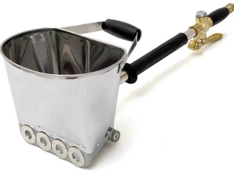 Erst tauchst Du den Trichter in den Mörteleimer ein – dann sprühst Du den Putz durch die Düsen auf die Wand. Zwei rutschfeste Griffe erleichtern das Handling.