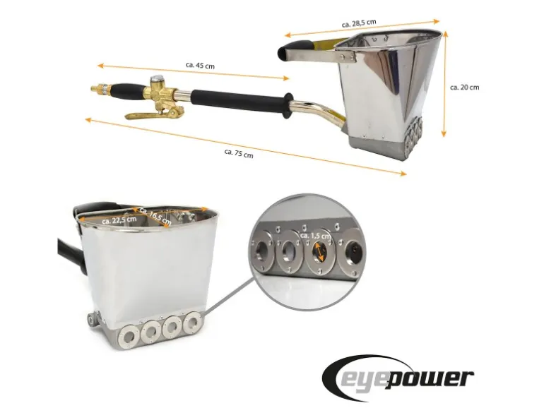 Jede Düse Ø 1,9 cm. Ergonomischer Griff, ca. 75 x 20 cm. Trichter ca. 20 x 22,5 x 16,5 cm.