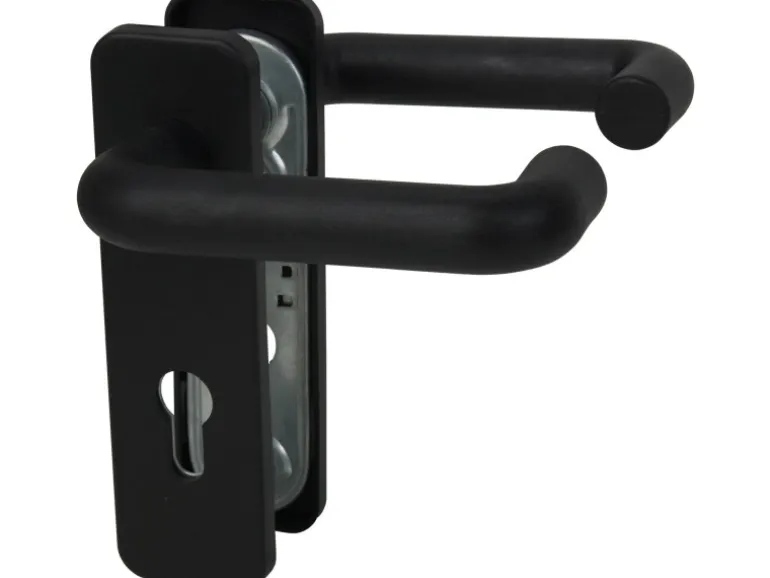 Kurzschildgarnitur „Nylon“ in Schwarz für Wohnungseingangstüren. Die Garnitur ist mit einer 72 mm Profilzylinder Lochung versehen und passend für Türen mit einer Türstärke von 37 – 42 mm.