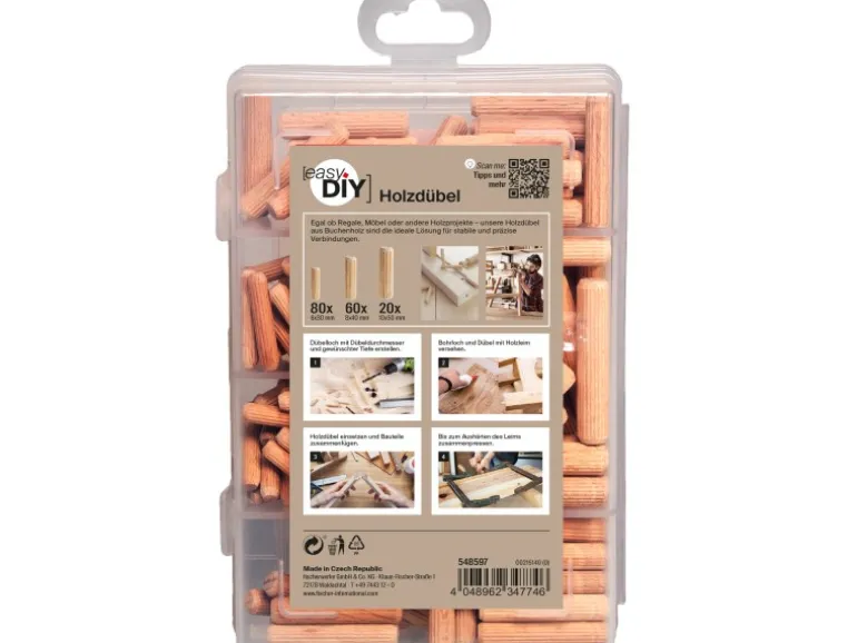 Die fischer EasyDIY Box Holzdübel ist ein 160-teiliges Holzdübelset. Es eignet sich ideal zum Verbinden von Massivholz und Plattenmaterialien aus Holzwerkstoffen. Egal ob Regale, Möbel oder andere Holzprojekte, unsere Holzdübel aus Buchenholz sind die ideale Lösung für stabile und präzise Verbindungen deiner Lieblingsstücke. Die praktische Box aus hochwertigem Kunststoff mit transparentem Deckel sorgt für Ordnung und Übersicht.