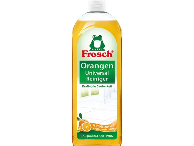Der Frosch Universalreiniger Orange ist ein kraftvoller Allzweckreiniger für die intensive Reinigung von Böden und fast allen abwischbaren Flächen. Seine Rezeptur besteht aus hochwirksamen Fettlösern aus der Orangenschale und stark schmutzlösenden Seifen. Er entfernt Fett und Schmutz zuverlässig und rückstandsfrei. Der dermatologisch getestete Frosch Universalreiniger hinterlässt einen angenehm frischen Orangenduft und sorgt so für ein wohltuendes Dufterlebnis bei jeder Reinigung.