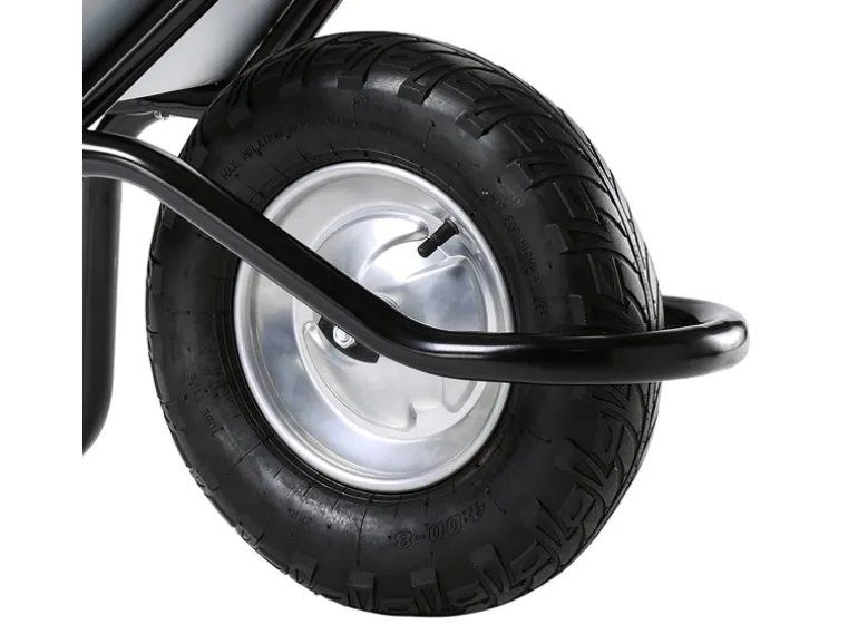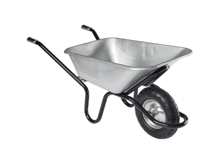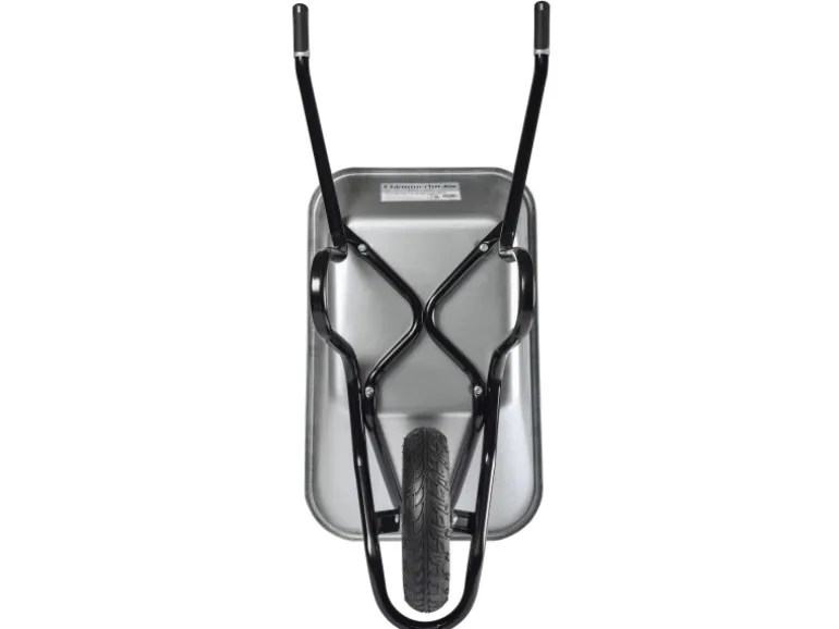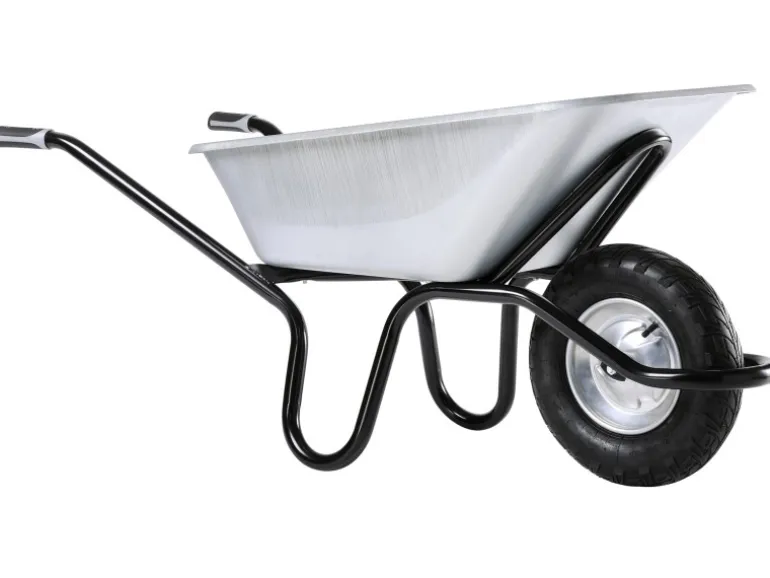 Rutschsichere 2-Komponenten-Griffe und ein pannensicheres Rad auf Stahlfelge mit Kugellagern ergänzen die hochqualitative Ausstattung dieser schlagfesten Profischubkarre mit verzinkter 120-l-Tiefmulde.