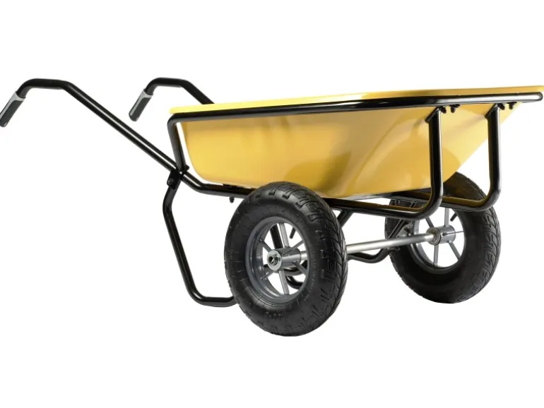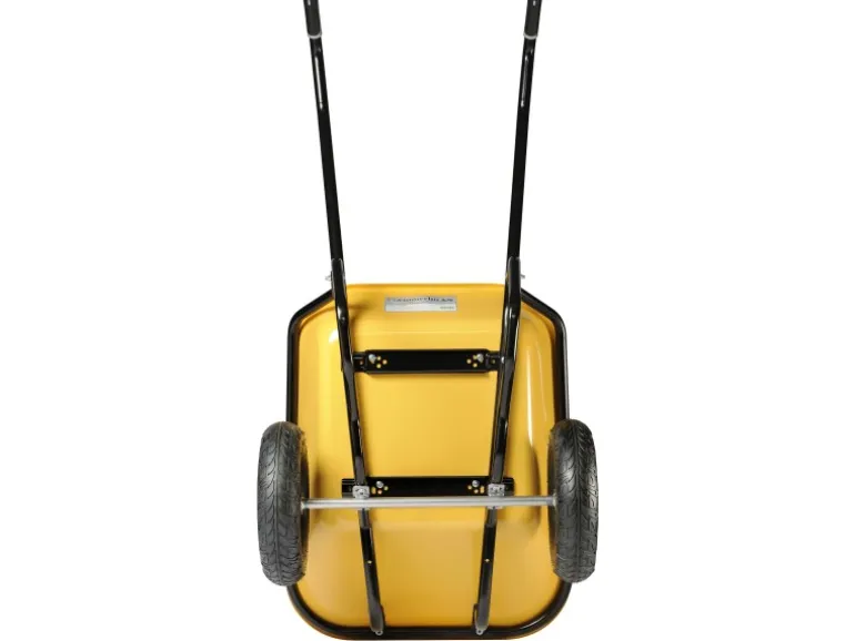 Die zweirädrige Schubkarre bietet außergewöhnlichen Bedienkomfort und erleichtert den Transport der Last, die hauptsächlich auf den beiden Rädern ruht.
