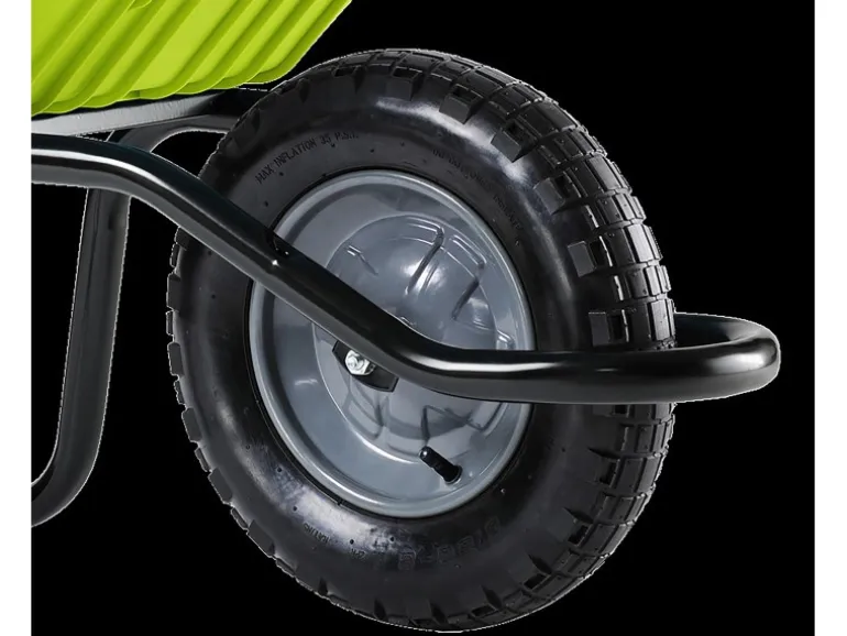 Ergonomische Griffe und ein hochwertiges Luftrad mit Schlauch ergänzen die Ausstattung dieser trendfarbigen Kunststoffmuldenschubkarre.