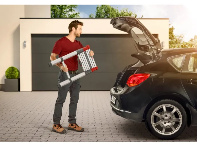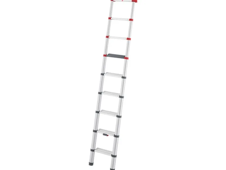 Je nach Bedarf ist sie stufenweise ausziehbar und verfügt über eine farbige Verriegelungsanzeige. Sie ist mit Alu-Stufen (80 mm) mit Anti-Rutsch-Riffelung und gummiertem Wandstoßschutz für oberflächenschonendes Anlegen an Wände ausgestattet und kann platzsparend zusammengeschoben werden. Die Leiter ist bis 150 kg belastbar.