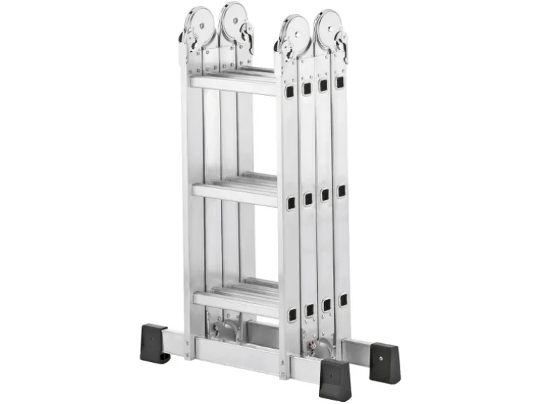 Zum Transport oder zum Verstauen ist sie kompakt zusammenfaltbar: 91 cm x 77 cm x 120 cm. Sie verfügt über rutschfest geriffelte Sprossen, 2 stabile Querbalken mit standsicheren PVC-Füßen (Querbalken-Länge 77 cm) und ist bis 150 kg belastbar.