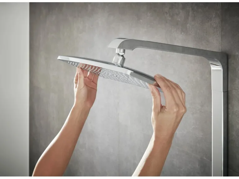 Durch Hansgrohe QuickClean, die Antikalk-Funktion für Duschköpfe und Armaturen entfernen Sie Kalkablagerungen auf den Silikondüsen schnell und einfach per Hand.