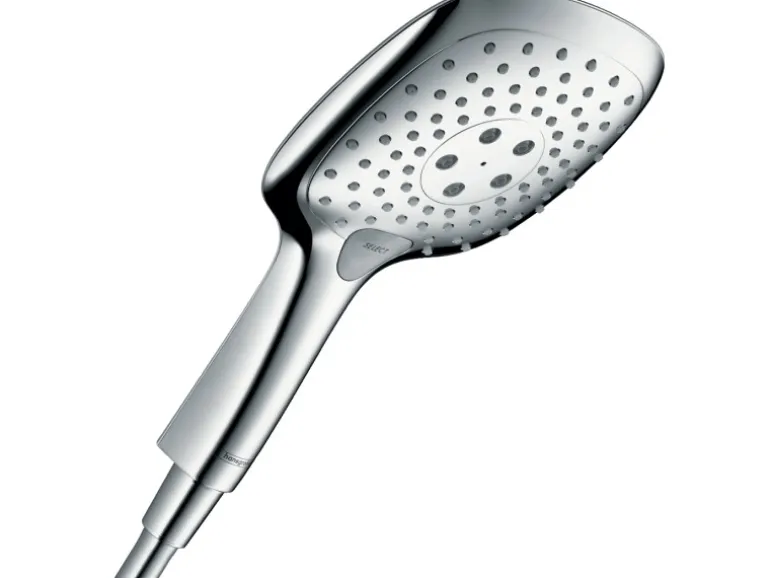 Beim Raindance Select E 150 3jet Duschkopf sind verschiedene Strahlarten möglich. Der RainAir-Strahl sorgt für eine angenehme, großflächige Regendusche – dank mit Luft angereicherter Tropfen. Belebend wirkt der starke und konzentrierte Massagestrahl CaresseAir, der optimal Verspannungen im Schulter- und Nackenbereich löst. Der Mix-Strahl macht das Wellnessprogramm perfekt, da er beide Strahlen vereint. Alle Strahlarten sind bei der Raindance Select E 150 3jet Handbrause einfach und variabel durch Knopfdruck (Select) wählbar.