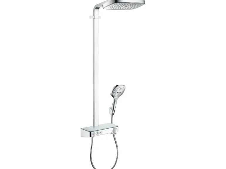 Wer das Duschsystem Hansgrohe Raindance Select 300 3jet kauft, kann sich auf praktisches Komplettset für die Dusche freuen. Dank der Brausestange und dem Brausehalter findet der Duschkopf inkl. Brauseschlauch optimalen Halt. Außerdem bringen die große Kopfbrause das Brausethermostat mit praktischer Ablagefläche (Sicherheitsglas) zusätzliche Flexibilität.