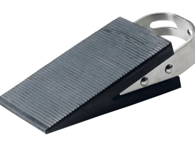 Schwarzer Gummi-Türkeil mit rostfreiem Edelstahl-Griff. Auch für den Außenbereich geeignet.