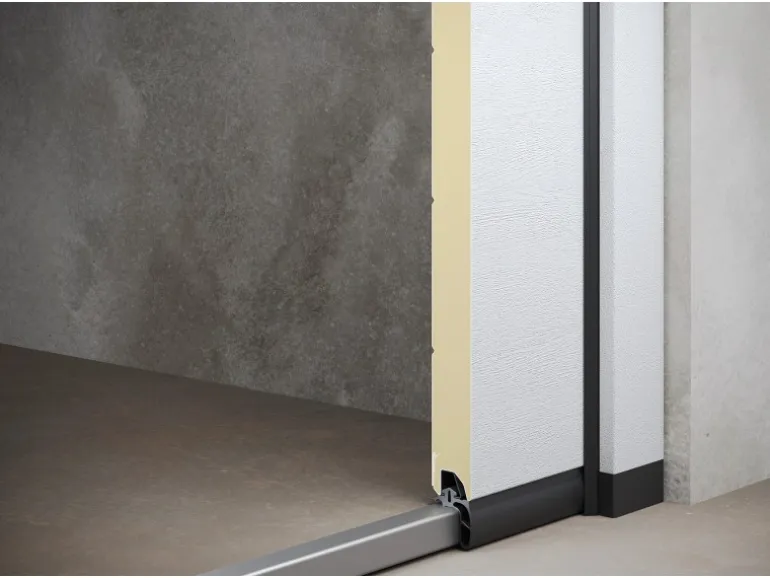 Das Hörmann Renovierungs-Set ermöglicht durch den ausgeklinkten hinteren Teil des Kunststoff-Zargenfußes eine Montage auf der Bodenschiene des alten Schwingtors. Das Set besteht aus einem speziellen Auflaufstück und einer speziell geformten Bodendichtung, die das Tor sauber vor der Anschlagschiene abdichtet.