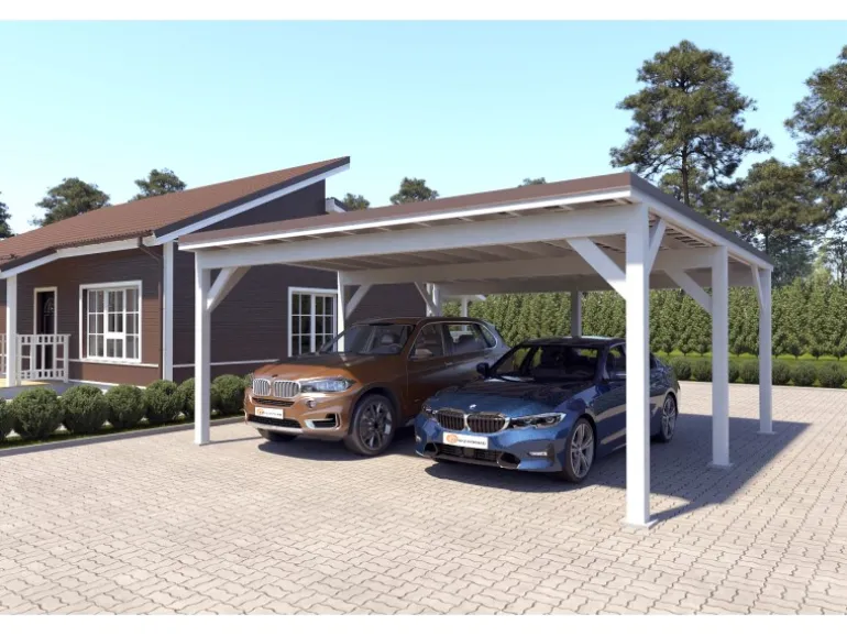 Die Carports von Holzbrüder werden als komplettes Set geliefert. Im Preis ist alles enthalten: hochwertiges, in Reinweiß gestrichenes nordisches Holz, ein dunkelbraunes Ruukki-Stahlblechdach, Befestigungsmaterial sowie werkseitig vorgefertigte Bauteile. Sie müssen nichts separat besorgen – einfach bestellen und aufbauen.