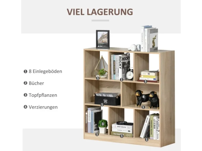 Entdecke die Freude am Ordnen mit dem modernen Regal von HOMCOM! Drei großzügige Einlegeböden und acht versetzte Trennwände bieten viel Platz für Bücher, Deko und Pflanzen. Die Regalrückwand sorgt dafür, dass alles sicher an seinem Platz bleibt. Das schlichte und moderne Design dieses Bücherregals passt perfekt zu verschiedenen Einrichtungsstilen. Es ist die ideale Lösung, um neuen Platz für Bücher und Dekoration zu schaffen.
