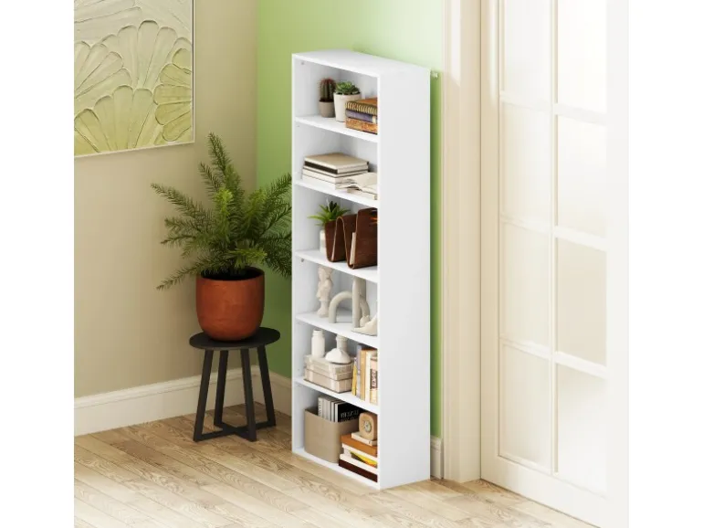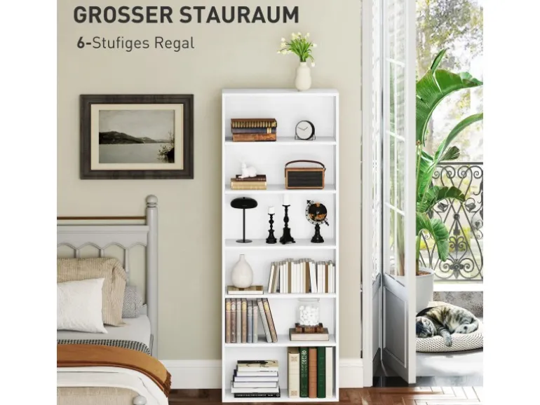 ● Sechs offene Fächer organisieren Bücher und Dekorationsartikel