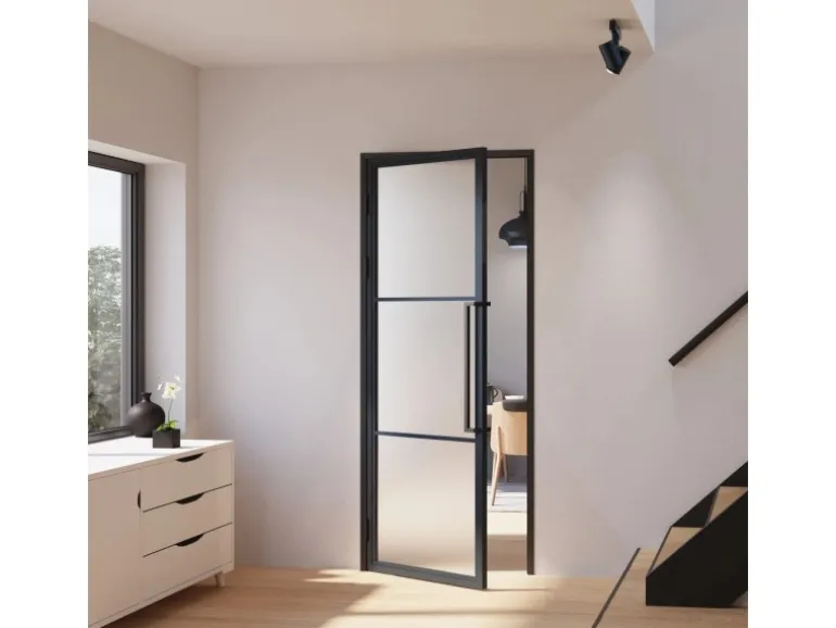 Die Stahltüren mit Zarge werden aus 4mm starkem Sicherheitsglas gefertigt. Bei der 40mm tiefen Rahmung der Stahl-Loft-Tür handelt es sich um schwarz pulverbeschichteten Stahl, welcher sowohl mit seiner Kratz- als auch Stoßbeständigkeit überzeugt. Für die nötige Sicherheit sorgen außerdem drei zuverlässige Scharniere sowie ein praktischer Magnetschließer. Die Sprossen sind mit der Rahmenkonstruktion verbunden.