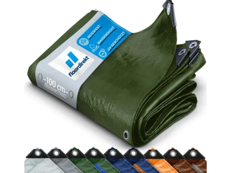 Die wasserdichte Abdeckplane setzt sich aus sehr robustem High Density Polyethylen-Gewebe sowie einer beidseitigen Polyethylen-Beschichtung zusammen. Die rostfreien Metallösen entlang der Kanten sorgen bei der Befestigung der Plane für Stabilität und Halt. Ein auf der Innenseite entlang des Randes eingearbeitetes Seil sorgt zusätzlich für mehr Belastbar- und Reißfestigkeit. Erhältlich ist die Gewebeplane in vielen verschiedenen Maßen und Farben.