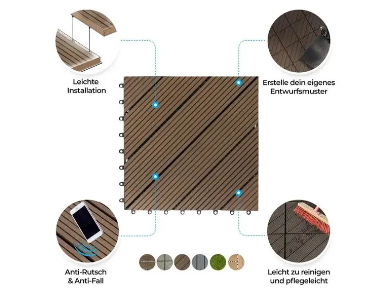 Die WPC Fliesen bedürfen einer sorgsamen Behandlung. Verwenden Sie bitte keine chemischen Reinigungsmittel und keinen Hochdruckreiniger.