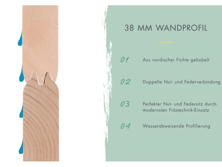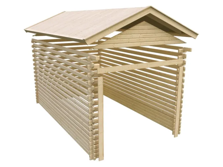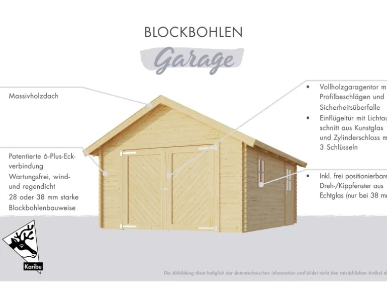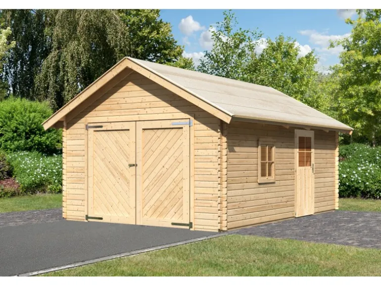 In der Blockhausgarage findet alles seinen passenden Platz. Ob Auto, Werkzeug oder Gartengeräte, die Blockhausgarage zeichnet sich als ein wahrer Alleskönner aus. Die hochwertige Garage ist aus 38 mm starken Blockbohlen gefertigt und zeichnet sich in Kombination mit einem 19 mm starken Massivholzdach als äußerst langlebig und stabil aus. Die einzelnen Bohlen sind aus einem nordischem Fichtenholz gefertigt und verfügen über 6-plus-Eckverbindungen, die ihnen eine einfache Montage garantieren. Während das Garagentor mit einer umlaufenden Doppelrahmenkonstruktion zu überzeugen weiß, lässt sich die praktische Einflügeltür in der Seitenwand frei positionieren. Somit genießen Sie den Vorteil, dass Sie zum Betreten der Garage nicht immer das komplette Tor öffnen müssen.