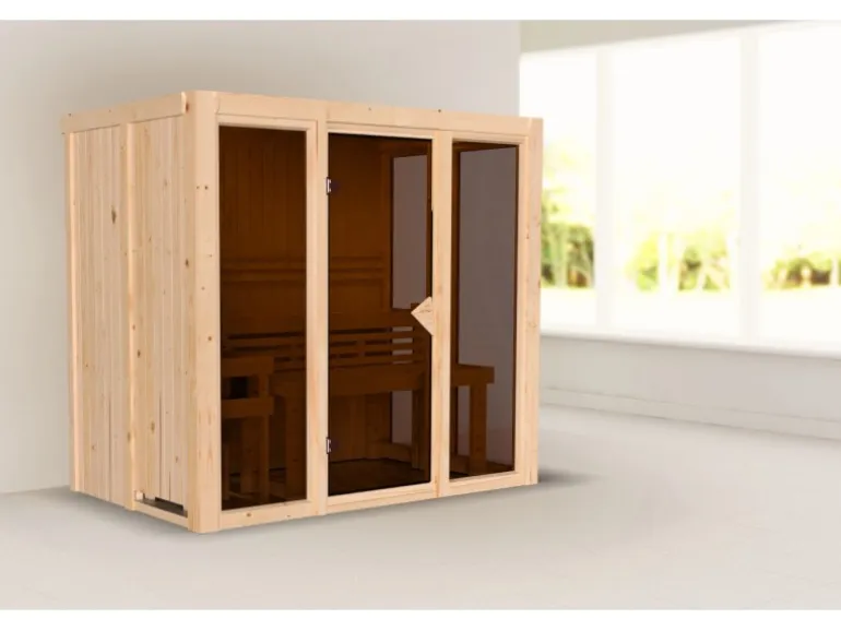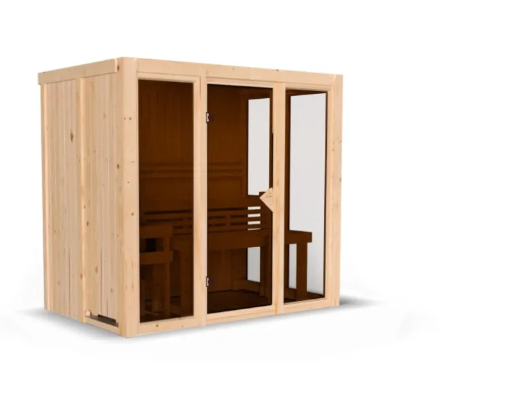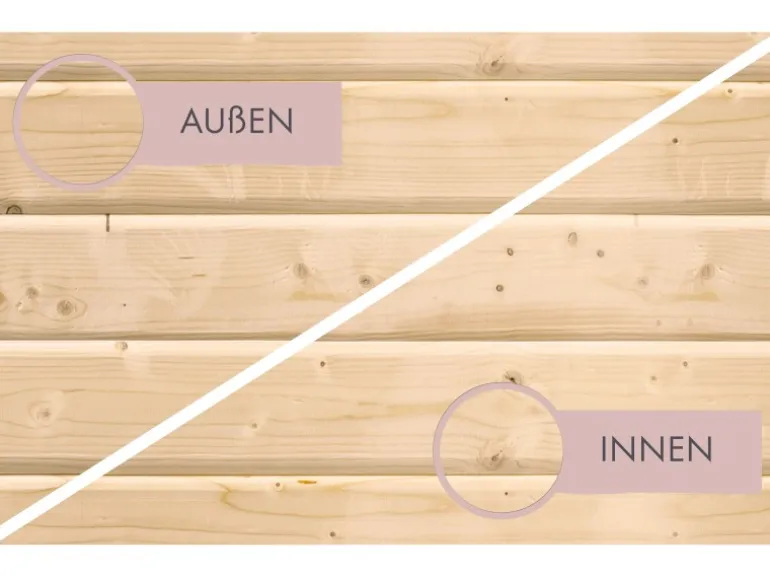 Die Lieferung erfolgt inklusive Ofenschutzgitter. Elementsaunen haben zwei Sichtseiten und zwei Seiten, die mit einer Hartfaserplatte ausgestattet sind.