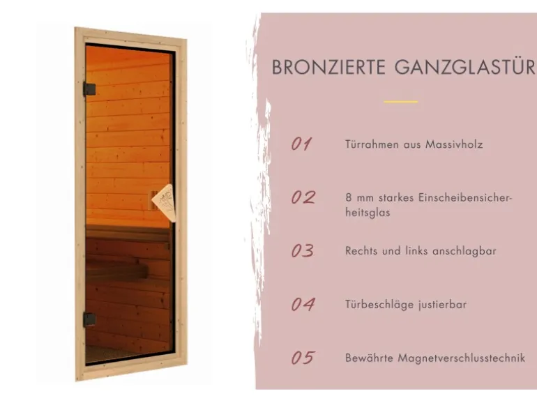Inklusive rechts und links anschlagbarer Saunatür