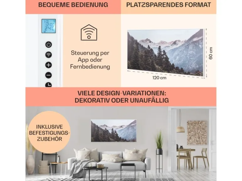Klarstein Wonderwall Air Art Smart Infrarotheizung 120×60 cm 700 W Wandinstallation App-Steuerung Motiv Berge Weiß