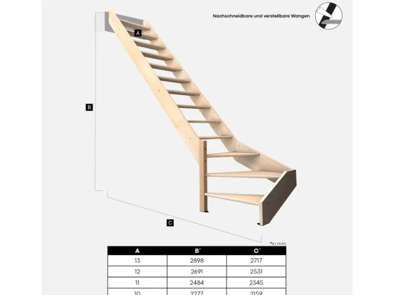 Abmessungen der Treppe: Höhe bis zu 2898 mm. Treppenöffnung 925 x 2015 mm.
