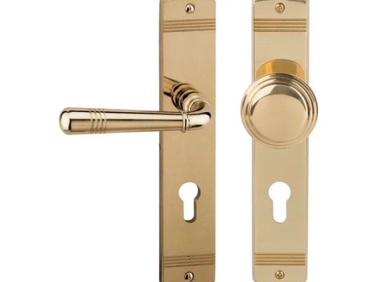 Langschildgarnitur „Sale-LS“ in Messing Poliert für Wohnungseingangstüren. Die Garnitur verfügt über eine Rückholfeder und garantiert somit einen dauerhaft waagrechten Sitz des Drückers. Die Garnitur ist mit einer 72 mm Profilzylinder Lochung versehen und passend für alle gängigen Türen mit einer Türstärke von 37 – 42 mm.